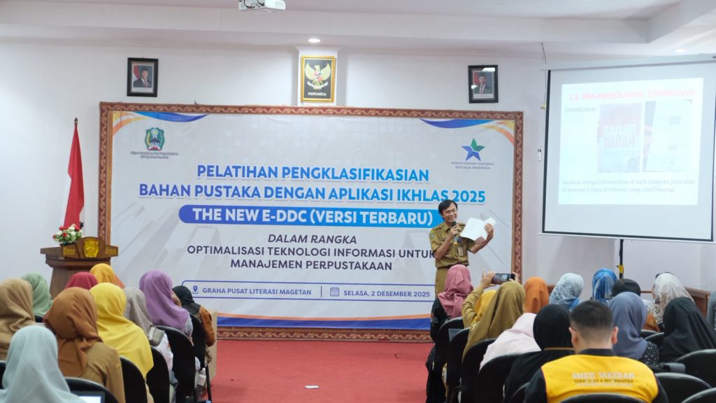 Dalam rangka meningkatkan kualitas pengelolaan Perpustakaan Sekolah di Kabupaten Magetan khususnya kompetensi SDM Perpustakaan. Dinas Kearsipan dan Perpustakaan Kab. Magetan (Arpus) mengadakan Pelatihan Pengklasifikasi Bahan Pustaka Dengan Aplikasi IKHLAS 2025. Bertempat di Gedung 1 Graha Pusat Literasi Magetan, pelatihan dilaksanakan pada Selasa 2 Desember 2025 yang berkesempatan dibuka oleh Kepala Dinas Arpus Kab. Magetan, Suhardi, M.M.Pd. Adapun peserta pelatihan yaitu para tenaga dan pengelola Perpustakaan sekolah mulai jenjang SD, SMP, dan SMA sederajat.