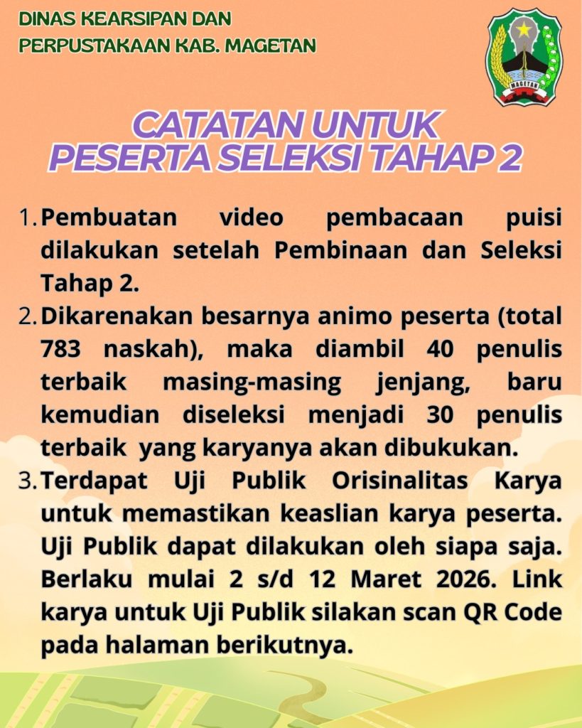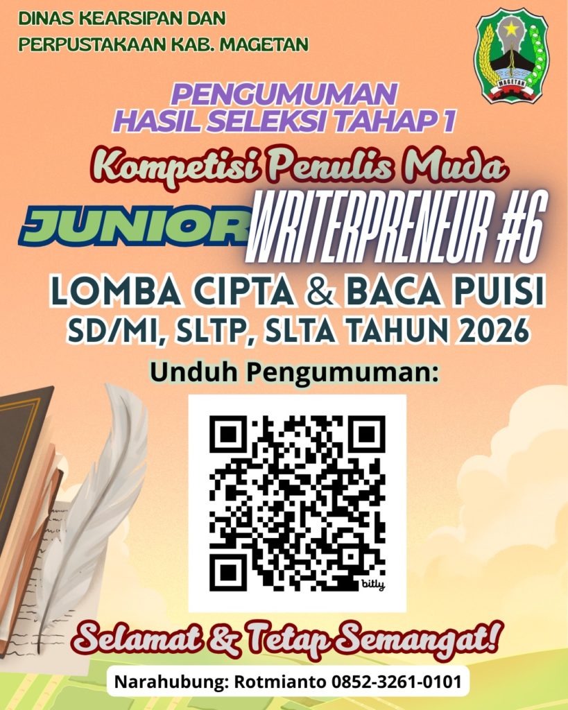 Akhirnya, yang ditunggu-tunggu telah tiba! Pengumuman Junior Writerpreneur #6 Lomba Cipta dan Baca Puisi Tingkat SD/MI, SLTP, SLTA Kabupaten Magetan Tahun 2026. Hasil seleksi tahap 1 Junior Writerpreneur #6 dapat dilihat dengan melakukan scan pada QR yang tersedia. Selamat bagi yang lolos & jangan menyerah bagi yang belum berhasil. Tetap semangat berkarya untuk semua! (Narahubung: Rotmianto 0852-3261-0101)
