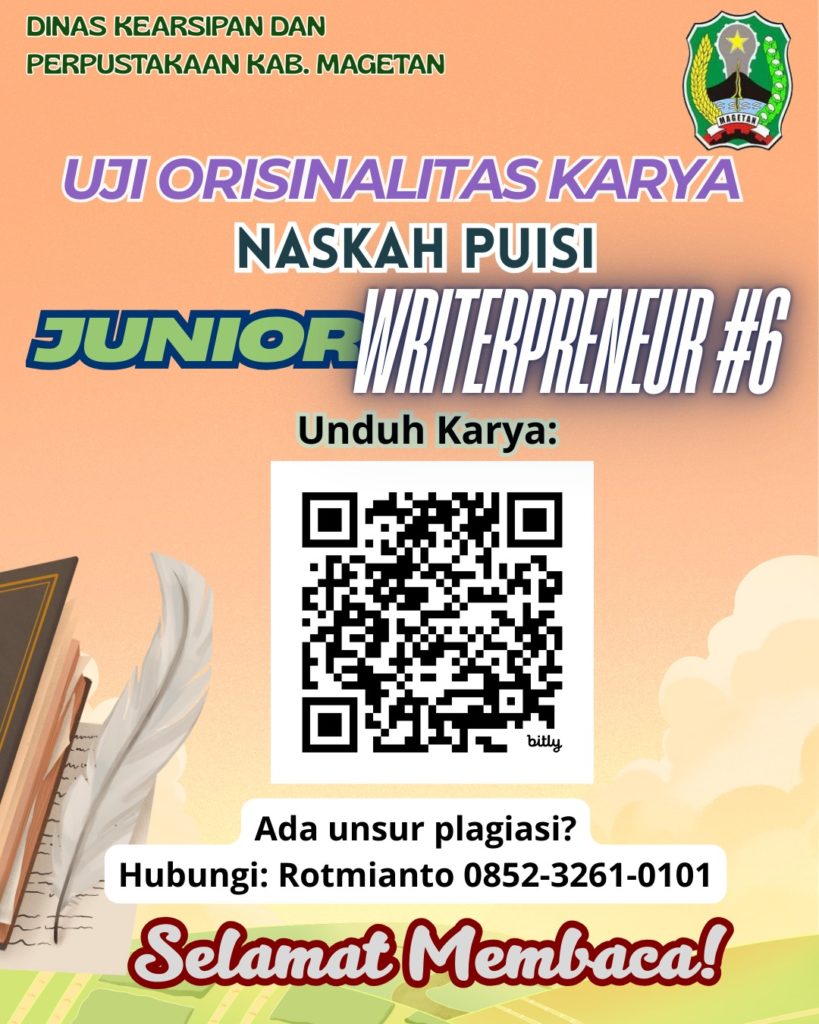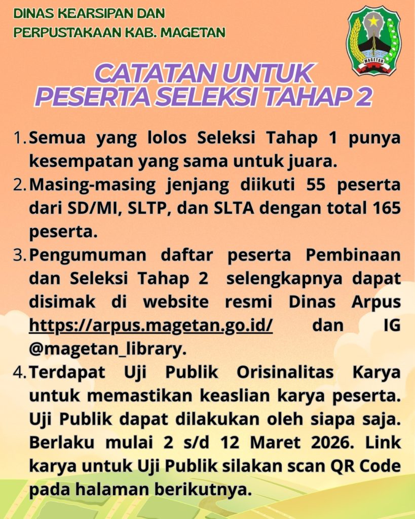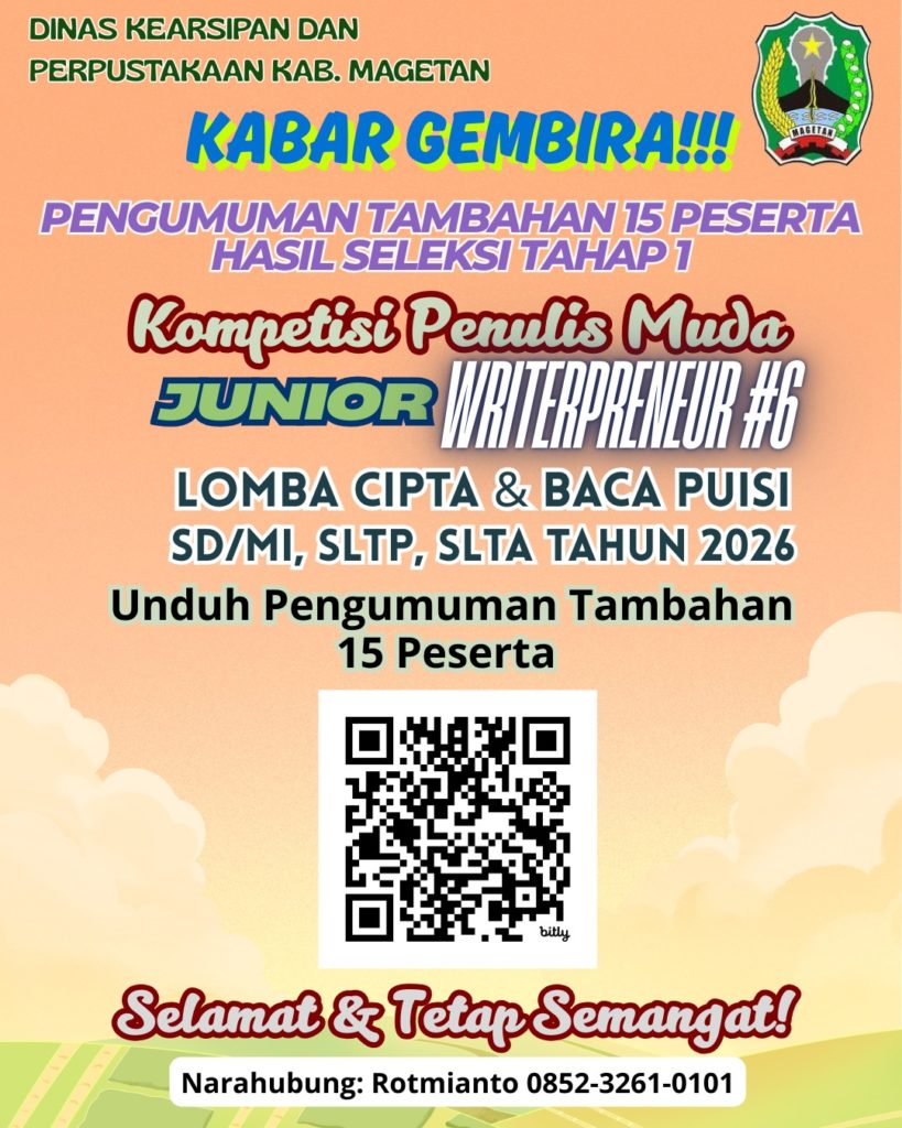 KABAR GEMBIRA!!! Berdasarkan pertimbangan untuk peningkatan literasi anak didik dan besarnya minat peserta Seleksi Tahap 1 Kompetisi Penulis Muda Junior Writerpreneur Lomba Cipta Baca Puisi (LCBP) Tingkat SD/MI, SLTP, SLTA Kabupaten Magetan Tahun 2026 yang mencapai 783 peserta, maka Dinas Kearsipan dan Perpustakaan memutuskan menambah 15 peserta masing-masing jenjang yang berhak mengikuti Pembinaan dan Seleksi Tahap 2. Selamat bagi yang lolos & jangan menyerah bagi yang belum berhasil. Semua punya peluang yang sama untuk juara! (Narahubung: Rotmianto 0852-3261-0101)