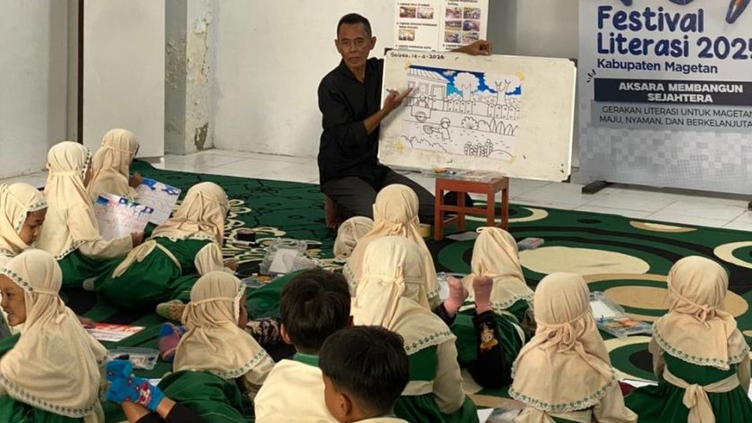 Melanjutkan kerjasama dan kolaborasi antara Perpustakaan Umum Magetan dengan para mitra, kembali dilaksanakan kelas gambar pagi hari dengan peserta siswa TK Aisyiyah 1 Magetan. Lokasi sekolah yang berdekatan dengan Perpustakaan Umum menjadi keuntungan istimewa sekolah ini. Kegiatan kolaboratif kelas menggambar terlaksana hari ini Selasa 14 April 2026 mulai jam 08.30 – 10.00 WIB, yang diikuti tak kurang dari 55 siswa TK beserta seorang Guru pendamping. Bertempat di ruang Kreativitas, kegiatan menggambar dipandu oleh pengajar dari kelas gambar reguler yaitu Pak Yus. Dengan tema gambar yaitu kebersihan lingkungan, anak-anak terlihat antusias dan bersemangat mengikuti kegiatan dari awal sampai selesai. Kegiatan kolaborasi ini sekaligus membuka kesempatan bagi sekolah-sekolah, komunitas, serta para mitra lainnya untuk turut berpatisapi menjalin kerjasama melalui kegiatan-kegiatan sejenis ataupun yang lain dalam rangka peningkatan literasi masyarakat. (nas)